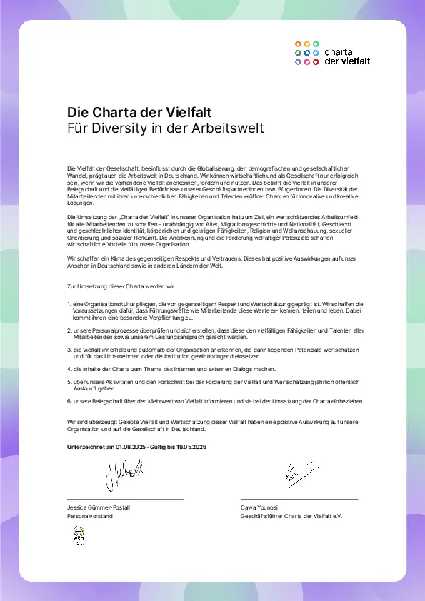 Die Charta der Vielfalt ist die bundesweit größte Arbeitgebendeninitiative zur Förderung von Diversity in der Arbeitswelt. Mit der Unterzeichnung im Jahr 2025 haben wir uns bewusst und dauerhaft dazu verpflichtet, ein Arbeitsumfeld zu schaffen, das frei von Vorurteilen ist – und in dem alle Mitarbeitenden Wertschätzung erfahren.